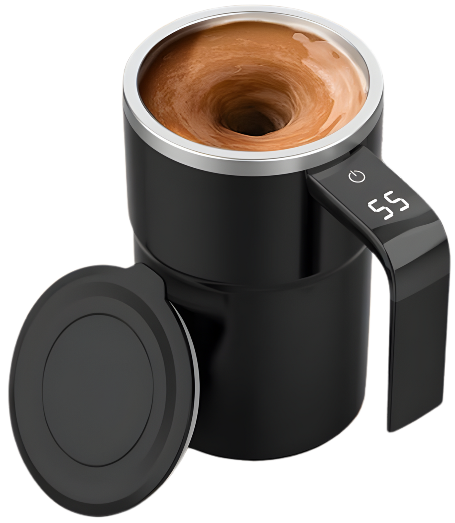 It uses a built-in magnetic mixer that automatically stirs your drink for 20 seconds, giving you a perfectly blended beverage with no spoon needed.